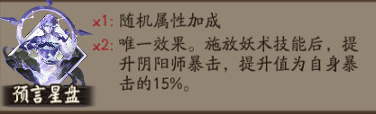 x2:唯一效果。施放妖術技能后,提升陰陽師暴擊,提升值為自身暴擊的15%。