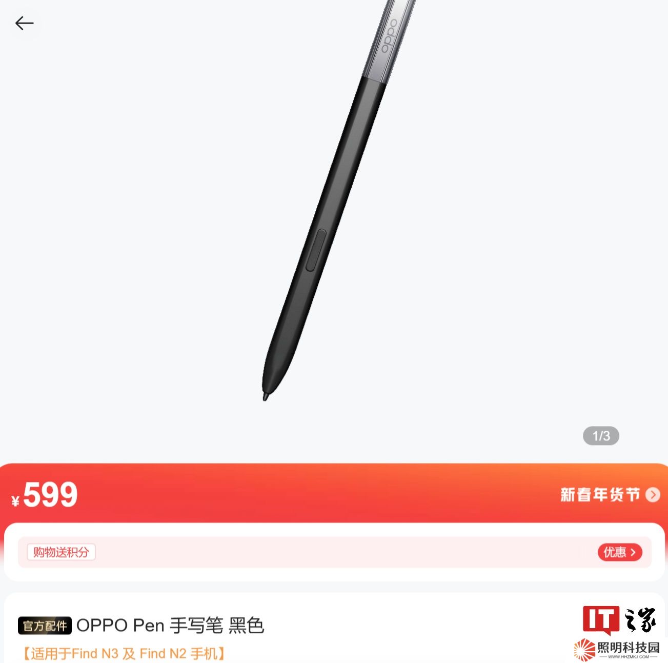目前 OPPO 官網(wǎng)在售有黑色款 OPPO Pen 手寫筆,定價(jià) 599 元,適配 FInd N3 和 Find N2 折疊屏手機(jī)。